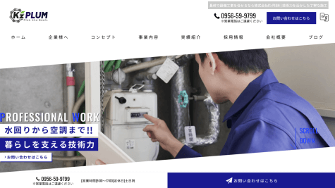 「ここに任せれば安心だ」と思ってもらえる施工を届けたい——株式会社K’z PLUMのサイトにはそのような言葉が掲げられており、技術の研鑽に励んだスタッフが施工に当たるというスタンスを明確にしている。長崎県佐世保市を拠点に、長崎周辺エリアから佐賀・福岡を含む九州各地まで出向いており、配管工の人手を求める企業からの発注にも対応している。管工事全般を事業内容とし、衛生設備・水道土木・空調・換気の各工事を請け負う。