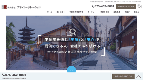 大切な住まいや土地の売却を前にして、何から動けばいいか分からないという状況は珍しくない。株式会社アヤ・コーポレーションは、そうした最初の一歩から伴走する姿勢を30年以上にわたって続けてきた。査定の根拠・手続きの流れ・費用の内訳と、判断に必要な情報を順序立てて伝え、デメリットも含めて説明する方針は、他と比較してからでも安心して戻ってこられる土台になっている。宅地建物取引業の免許は京都府知事(8)第9486号で、長年の営業実績を裏付けている。
